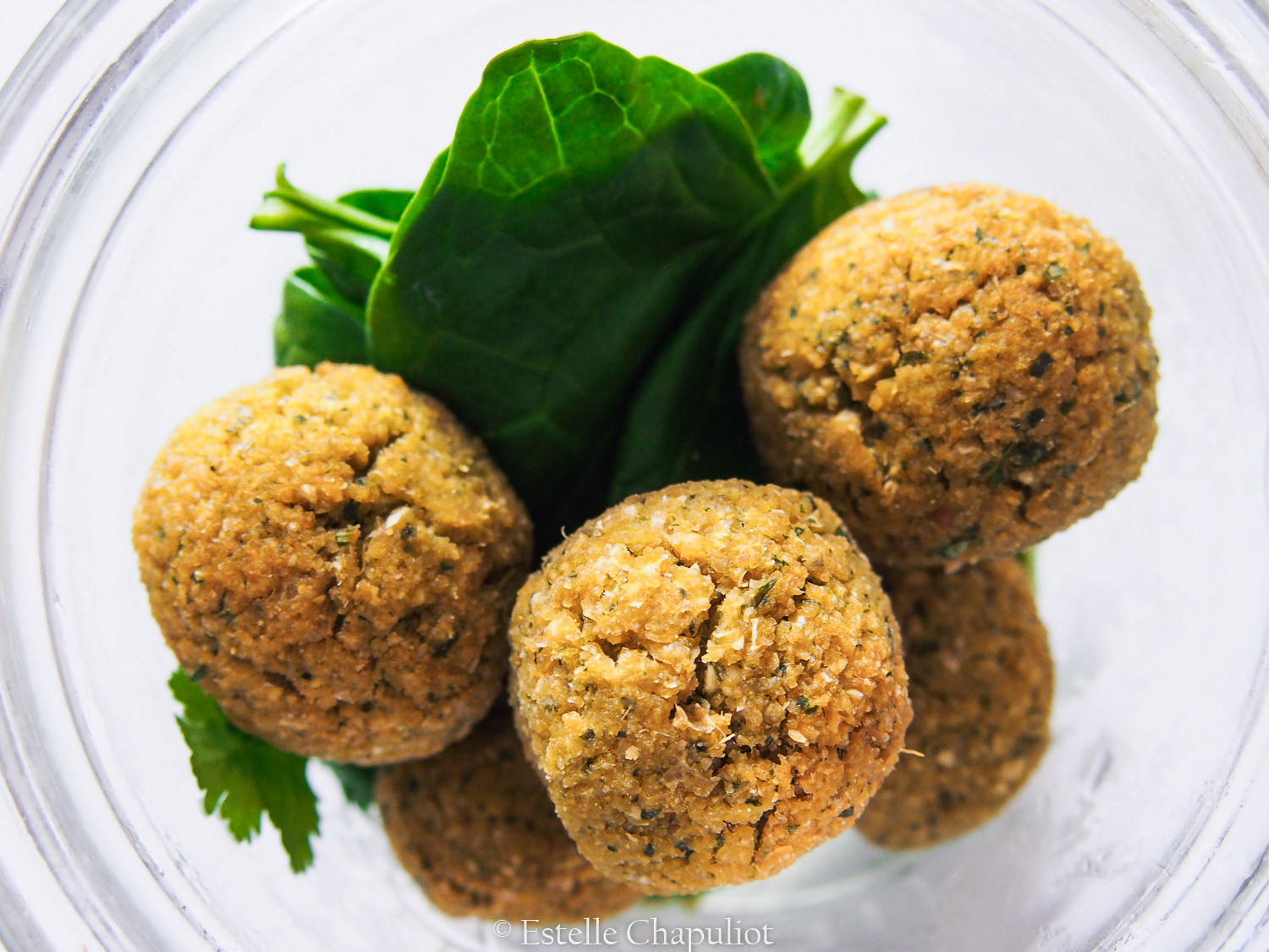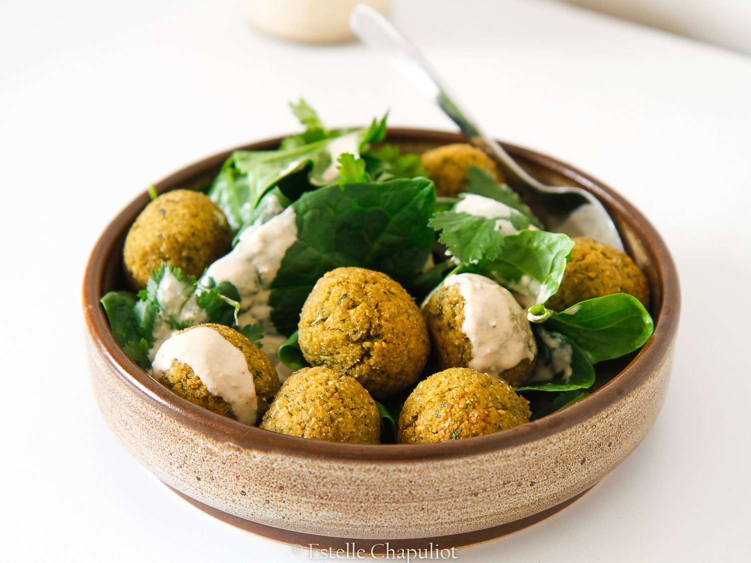 Ces falafels sont merveilleux tout juste sortis du four, arrosés d’un bon filet de sauce au sésame et accompagnés d’une salade de crudités et/ou d’une poêlée de légumes.