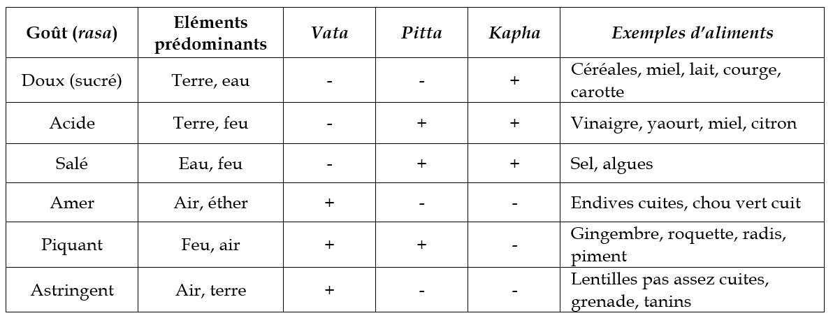 L’Ayurveda distingue 6 goûts (rasas) : le sucré, l’acide, l’amer, le piquant, l’astringent. Le ou les goûts prédominants d’un aliment sont des bons indicateurs des effets de cet aliment sur le corps : les goûts partageant un élément commun avec un dosha l’augmentent (aggrave), alors que ceux qui sont opposés à la nature du doshas le diminuent (soulage).