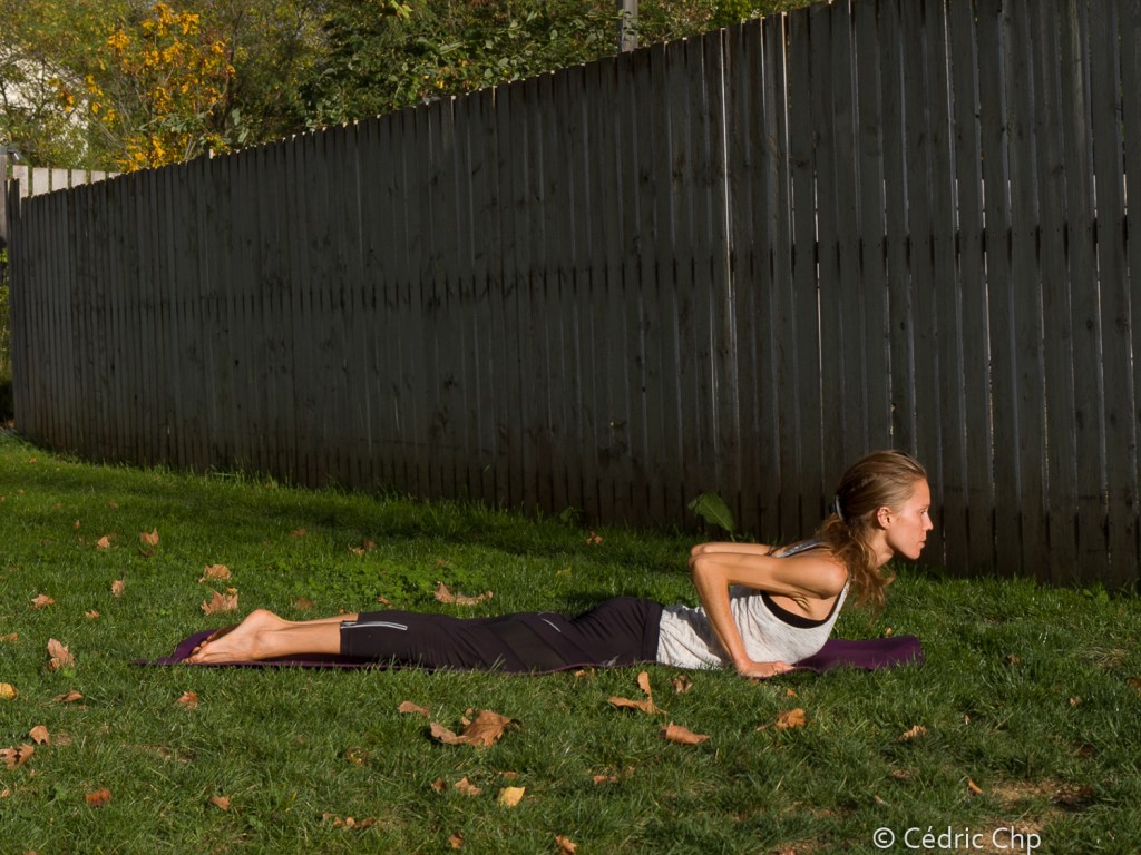 Glisser la poitrine vers l’avant, paumes de mains au sol, puis relever légèrement le buste en contractant les muscles du dos [Inspiration]