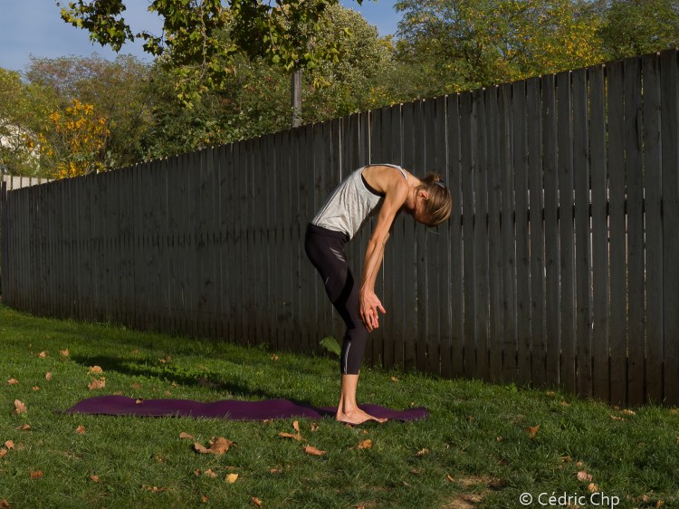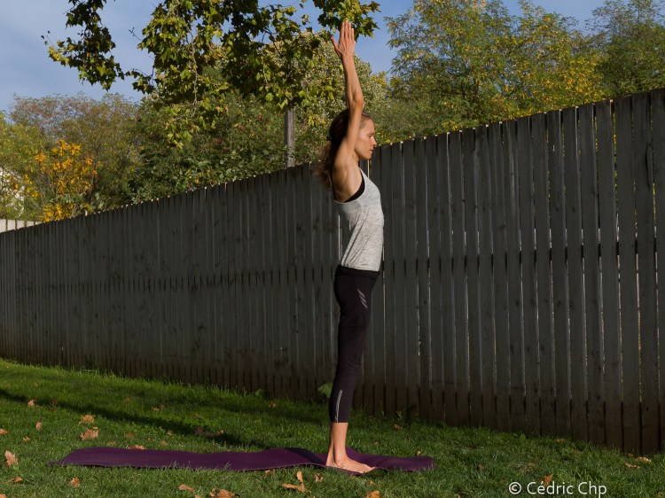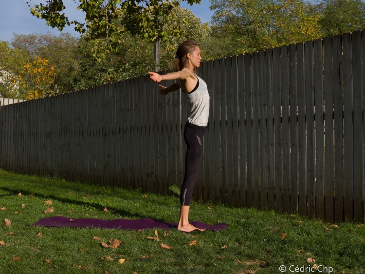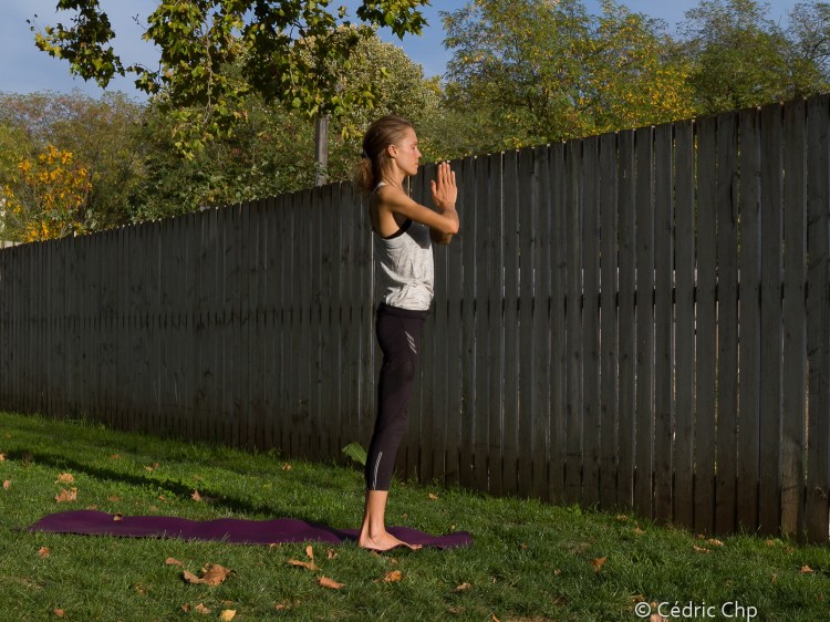 – Position de départ : debout, bien droit(e), les bras le long du corps ou en prière au niveau du cœur. Se mettre pieds nus (ça glisse moins qu’avec des chaussettes), ou en chaussettes, selon votre préférence.